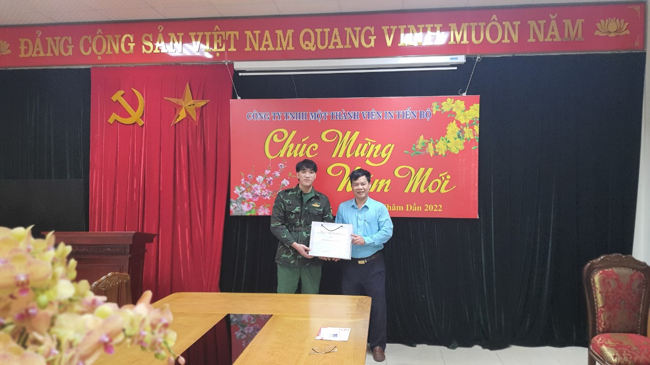 Trong đợt tuyển quân đầu năm 2022, Công ty In Tiến Bộ có 01 công nhân viên được địa phương tuyển chọn và gọi nhập ngũ. Trong những năm qua Đảng ủy, lãnh đạo Công ty và các tổ chức đoàn thể Công ty thường xuyên đẩy mạnh công tác tuyên truyền, vận động các đồng chí cán bộ, công nhân viên, người lao động là nam thanh niên trong độ tuổi sẵn sàng nhập ngũ, hăng hái tham gia thực hiện Nghĩa vụ quân sự khi được Hội đồng nghĩa vụ quân sự địa phương triệu tập.