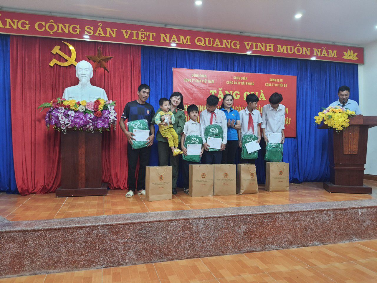 Đ/c Ngô Thị Thanh Bình, Chủ tịch CĐ Công an TPHP và đ/c Ngô Thu Hằng, Chủ tịch CĐ Tổng Công ty giấy Việt Nam trao quà cho các cháu học sinh có hoàn cảnh khó khăn