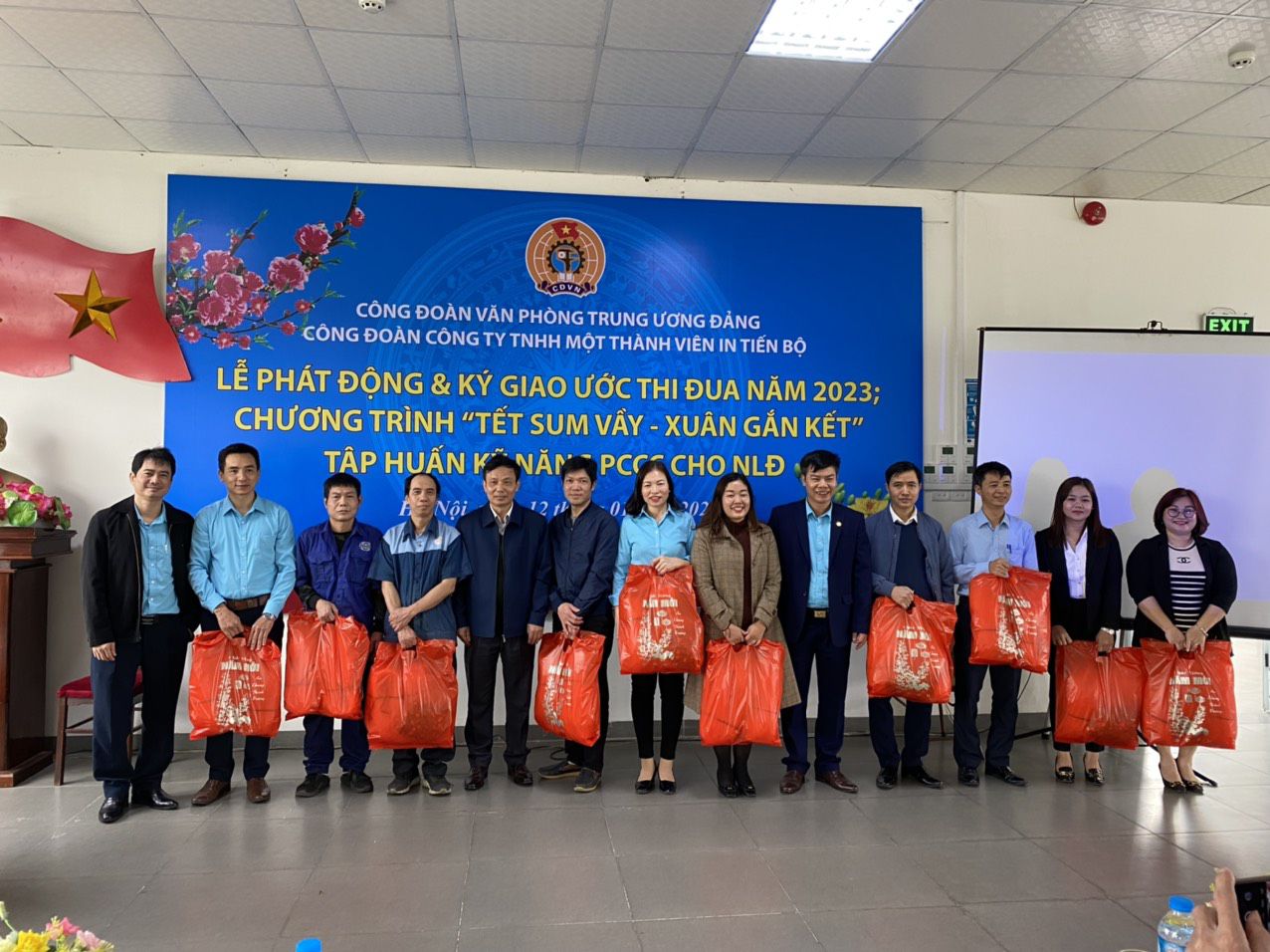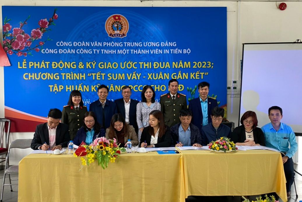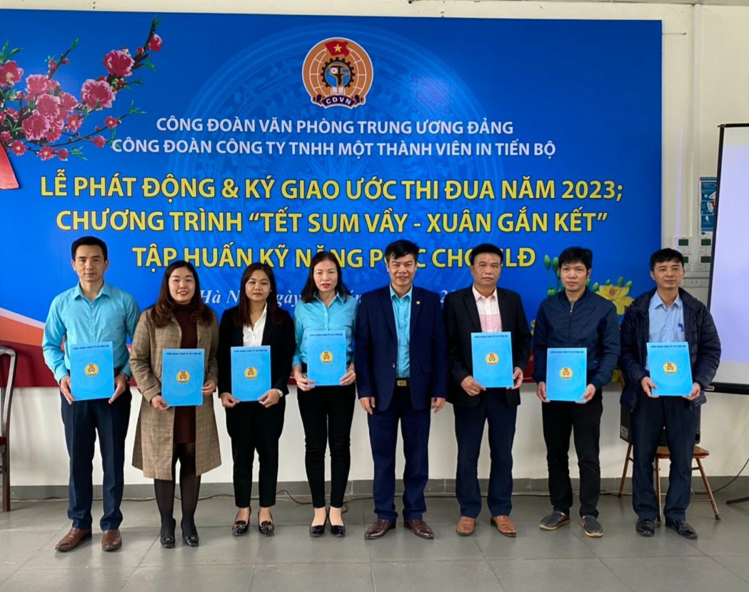 Nhằm thiết thực tổ chức triển khai, thực hiện có hiệu quả chủ trương của Tổng Liên đoàn lao động Việt Nam, Công đoàn Viên chức Việt Nam, Công đoàn Văn phòng Trung ương Đảng về việc chăm lo đời sống, vật chất, tinh thần cho đoàn viên, người lao động nhân dịp Tết nguyên đán Quý Mão năm 2023. Được sự đồng ý của Đảng ủy, lãnh đạo Công ty In Tiến Bộ, Công đoàn Công ty đã tổ chức Lễ phát động và ký giao ước thi đua năm 2023; tổ chức Chương trình "Tết sum vầy, Xuân gắn kết" năm 2023; tập huấn kỹ năng phòng chống cháy nổ cho đoàn viên, người lao động nhân dịp tết Nguyên đán Quý Mão. Tham dự và chỉ đạo chương trình có các đồng chí: Phạm Văn Quân, Ủy viên Ban Thường vụ, Trưởng Ban chính sách, pháp luật Công đoàn Viên chức Việt Nam; Thượng tá Phạm Văn Mạnh, chuyên viên cao cấp Ban công đoàn Công an Nhân dân; Cao Thị Mai Hồng, Phó Chủ tịch Công đoàn Văn phòng Trung ương Đảng; Thượng tá Ngô Thị Thanh Bình, Chủ tịch Công đoàn công an thành phố Hải phòng; Đại úy Lương Cao Phong, Chủ tịch Công đoàn Công an huyện Tiên Lãng, báo cáo viên; Nguyễn Đức Thanh, Bí thư Đảng ủy, Chủ tịch Công ty In Tiến Bộ; Đoàn Đắc Trưởng, Phó Giám đốc, Chủ tịch Công đoàn Công ty; Nguyễn Thế Công, Phó Giám đốc Công ty; đại diện lãnh đạo Thủ trưởng các đơn vị trực thuộc và gần 100 đoàn viên, người lao động Công ty.