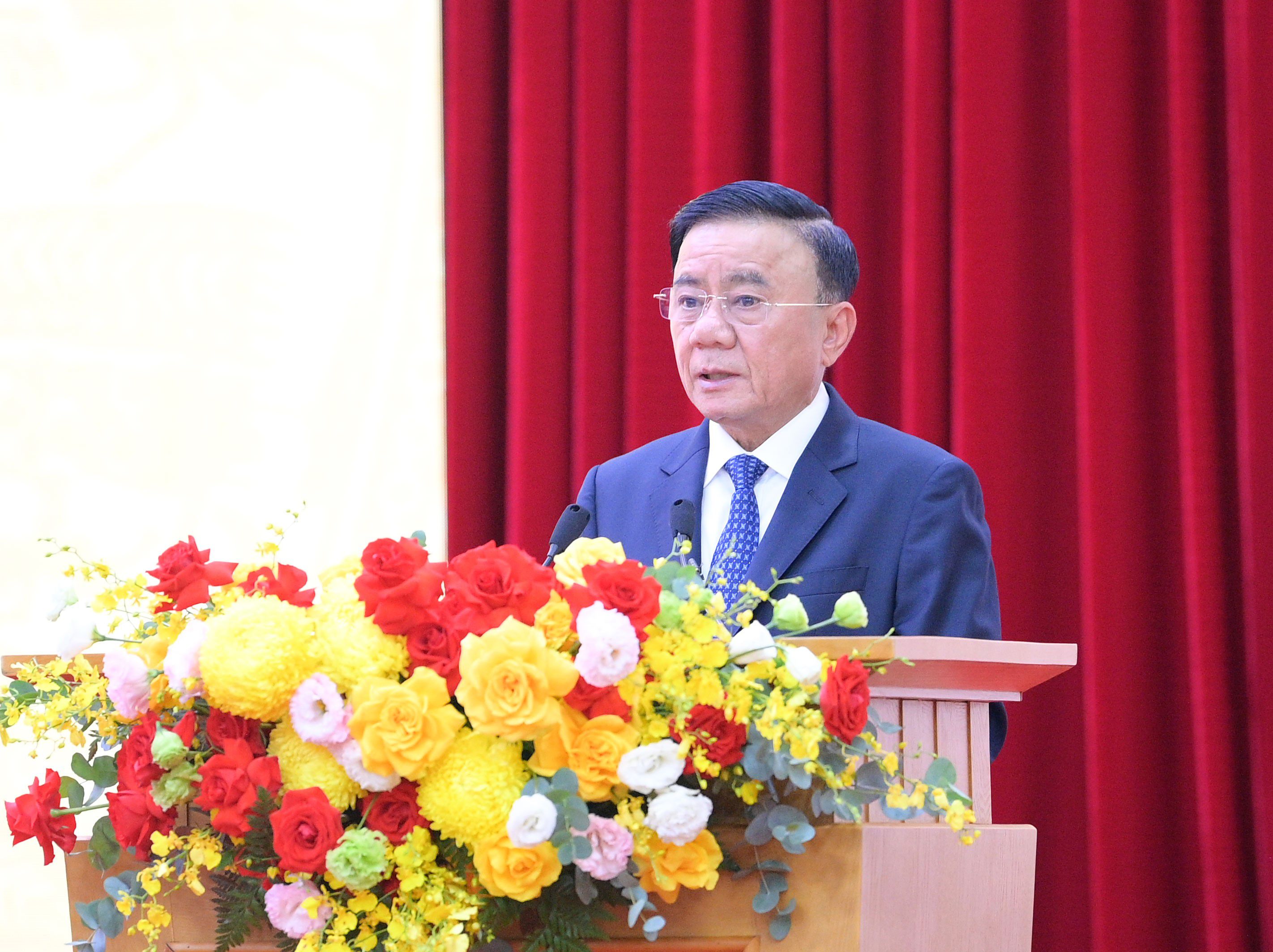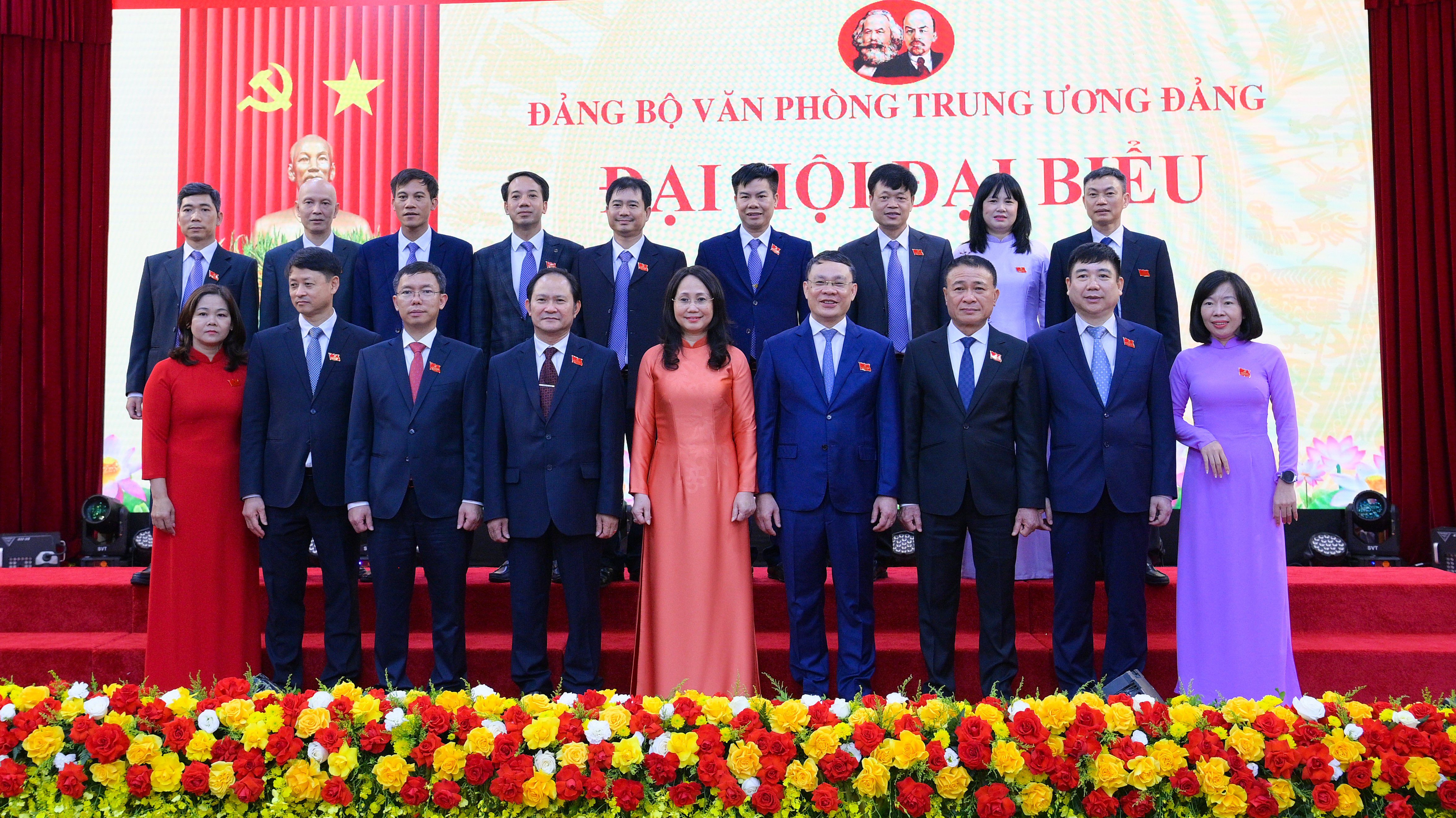 Đ/c Trần Cẩm Tú, Ủy viên Bộ Chính trị, Thường trực Ban Bí thư, Bí thư Đảng ủy các cơ quan Đảng Trung ương và đồng chí Lê Hoài Trung, Bí thư Trung ương Đảng, Chánh Văn phòng Trung ương, Phó Bí thư Thường trực Đảng ủy các cơ quan Đảng Trung ương tặng hoa chúc mừng BCH Đảng bộ Văn phòng Trung ương Đảng nhiệm kỳ 2025-2030