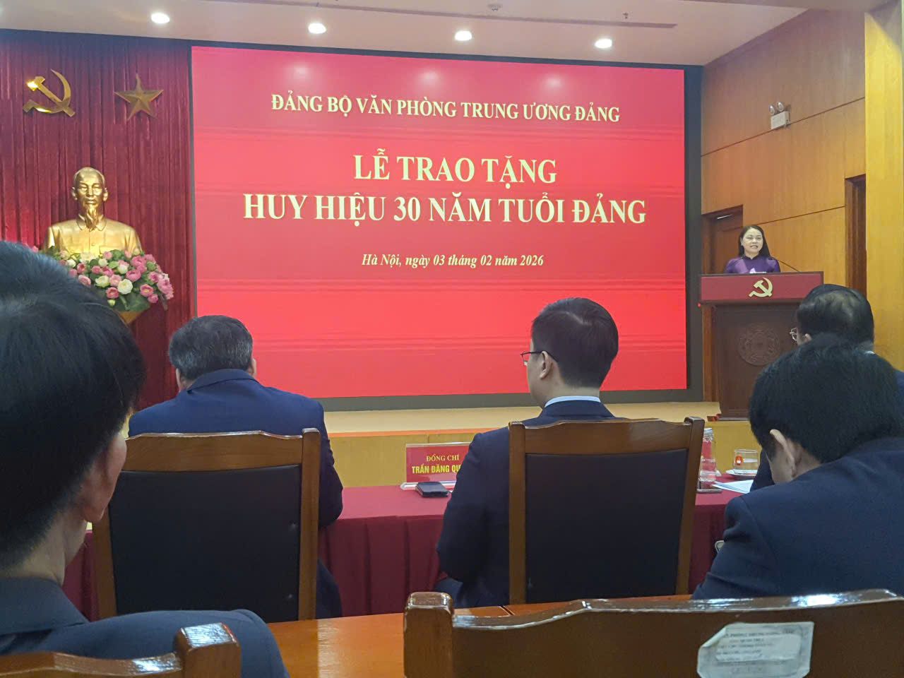 Nhân kỷ niệm 96 năm Ngày thành lập Đảng Cộng sản Việt Nam (3/2/1930-3/2/2026), ngày 03/02, Đảng ủy Văn phòng Trung ương Đảng long trọng tổ chức lễ trao Huy hiệu Đảng đợt 3-2 tặng các đồng chí đảng viên tiêu biểu đang sinh hoạt tại các chi bộ trực thuộc. Tham dự Lễ trao tặng huy hiệu 30 năm tuổi đảng có các đồng chí: Ủy viên Bộ Chính trị, Bí thư Trung ương Đảng, Chánh Văn Văn phòng Trung ương Phạm Gia Túc; Ủy viên BCH Trung ương Đảng, Bí thư Đảng ủy, Phó Chánh Thường trực Văn phòng Trung ương Đảng Nguyễn Thị Thu Hà; Ủy viên BCH Trung ương Đảng, Phó Bí thư Thường trực Đảng ủy, Phó Chánh Văn phòng Trung ương Đảng; Ủy viên dự khuyết BCH Trung ương Đảng, Trợ lý đồng chí Tổng Bí thư Trần Đăng Quỳnh; Ủy viên dự khuyết BCH Trung ương Đảng, Nguyễn Huy Dũng; Phó Bí thư Đảng ủy các cơ quan Đảng Trung ương Đỗ Việt Hà.