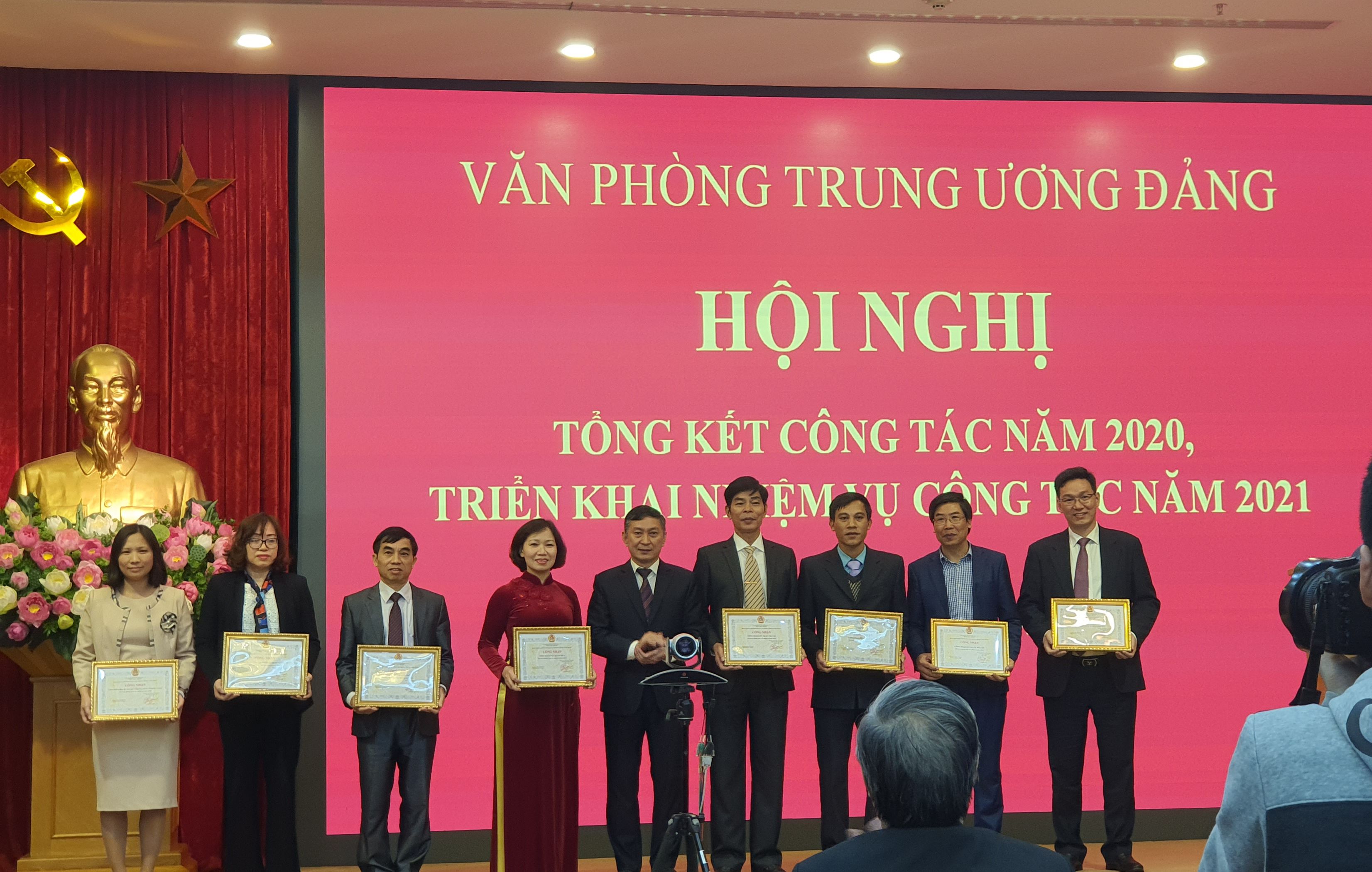 Đồng chí Nguyễn Đắc Vinh, Uỷ viên BCH Trung ương Đảng, Bí thư Đảng uỷ, Phó Chánh Văn phòng Trung ương đã trao Giấy khen của Đảng uỷ Văn phòng Trung ương cho 05 tổ chức đảng hoàn thành xuất sắc nhiệm vụ năm 2020; đồng chí Lê Khánh Toàn, Phó Chánh Văn phòng Trung ương Đảng, Chủ tịch Công đoàn Văn phòng Trung ương đã trao giấy chứng nhận công đoàn cơ sở hoàn thành xuất sắc nhiệm vụ năm 2020; Công đoàn Công ty In Tiến Bộ được công nhận tổ chức công đoàn hoàn thành xuất sắc nhiệm vụ.